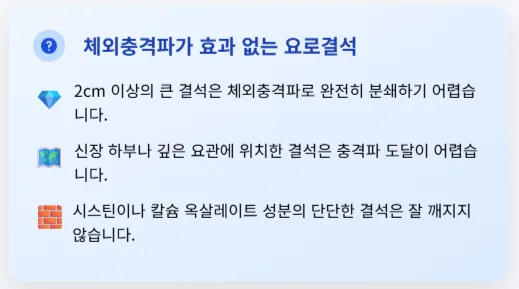 체외충격파쇄석술(ESWL)은 외부에서 충격파를 발생시켜 결석을 잘게 부수는 비침습적인 치료법입니다. 수술 없이 비교적 간편하게 치료받을 수 있고 회복이 빠르다는 큰 장점이 있어 요로결석의 1차 치료법으로 널리 사용되고 있습니다. 하지만 모든 요로결석에 만능인 것은 아닙니다. 어떤 경우에 체외충격파만으로는 해결이 어려운지 알아볼까요?