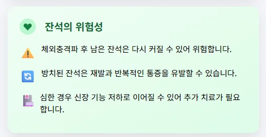 간혹 "남아있는 잔석, 괜찮을까요?"라고 묻는 환자분들이 있습니다. 체외충격파 후에도 완전히 제거되지 않고 남아있는 잔석은 다시 커지거나 통증을 유발하고, 심하면 신장 기능 저하로 이어질 수 있습니다. 따라서 잔석이 있다면 적극적인 추가 치료가 필요하다는 점을 꼭 기억해야 합니다.