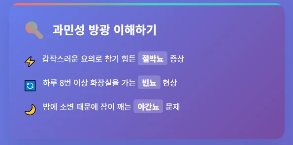 과민성 방광은 우리 몸의 방광 근육이 너무 예민하게 반응해서 생기는 문제입니다. 소변이 조금만 차도 "화장실 가!" 하고 비상벨을 울리는 것과 비슷하다고 생각하시면 됩니다.