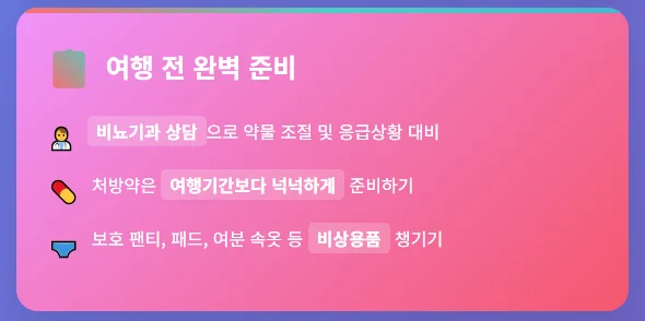 여행을 떠나기 전 꼼꼼한 준비는 과민성 방광 환자들에게 특히 중요합니다. 사전에 충분히 대비한다면 여행 중 발생할 수 있는 불안감을 최소화하고 더욱 즐거운 시간을 보낼 수 있습니다.
