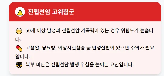 기타: 서구화된 식습관(특히 붉은 육류 및 고지방 식단), 흡연, 특정 직업 환경에서의 화학물질 노출 등도 전립선암의 위험 인자로 거론될 수 있습니다.