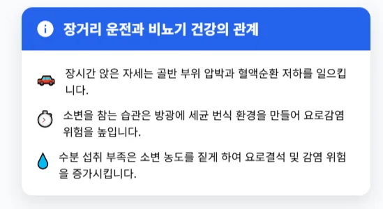 소변 정체: 운전 중에는 휴게소 접근성 문제로 소변을 참는 경우가 많습니다. 방광에 소변이 오래 고여 있으면 세균 번식의 좋은 환경이 되어 요로감염 위험이 높아집니다.
