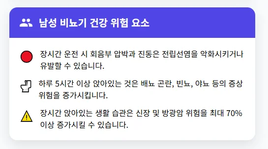 전립선염 악화: 장시간 운전 시 회음부의 압박과 진동은 전립선을 자극하여 전립선염 증상을 악화시키거나 새로운 염증을 유발할 수 있습니다. 이미 전립선염을 앓고 있는 30~50대 남성에게서 특히 주의가 필요합니다.