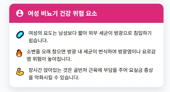 골반저 기능 장애 및 요실금: 출산이나 노화로 인해 골반저 근육이 약해진 여성의 경우, 장시간 앉아있거나 소변을 참는 행위가 골반저 근육에 부담을 주어 요실금 등의 증상을 악화시킬 수 있습니다.