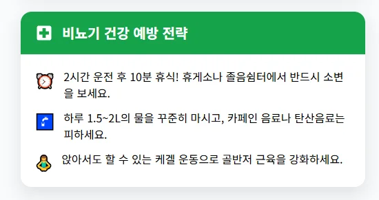 "2시간 운전 후 10분 휴식, 그리고 화장실 필수!": 아무리 급해도 건강보다 중요한 것은 없습니다. 1시간마다 5~10분씩 차를 세우고 간단한 스트레칭과 함께 반드시 소변을 보세요. 고속도로 휴게소나 졸음쉼터가 보이면 망설이지 말고 들르는 습관을 들이는 것이 중요합니다.
