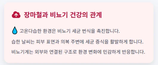 장마철은 단순히 습도만 높은 것이 아닙니다. 고온, 잦은 강수량, 그리고 실내 환기 부족과 같은 복합적인 환경 요인들이 함께 작용하여 비뇨기 건강에 부정적인 영향을 미칠 수 있습니다.