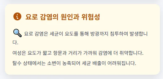 요로 감염은 신장, 요관, 방광, 요도로 이루어진 비뇨기계에 세균이 침투하여 염증을 일으키는 질환입니다. 대부분은 항문 주변에 살던 세균이 요도 입구를 통해 거꾸로 올라가 방광까지 도달하면서 발생합니다. 특히 여성분들의 경우 요도 길이가 남성보다 짧고, 항문과 요도 간 거리가 가까워 세균 침입에 훨씬 취약합니다.