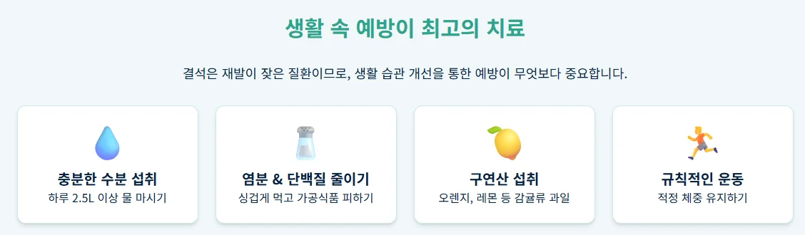 결석 예방에 가장 중요한 것은 바로 충분한 수분 섭취입니다. 하루 2.5~3리터 이상 물을 마시는 것이 좋아요. 소변을 묽게 만들어 결석을 형성하는 물질들이 뭉치지 않도록 도와주고, 작은 결석은 자연 배출되도록 돕습니다.