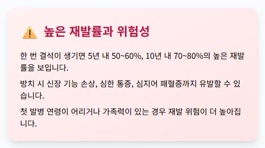 더 큰 문제는 높은 재발률입니다. 한 번 발생하면 5년 내 50~60%, 10년 내 70~80%의 높은 재발률을 보입니다. 첫 발병 연령이 어리거나 가족력이 있는 경우, 대사 이상이 동반된 경우 재발 위험이 더 높아지므로 꾸준한 관리가 필수적입니다.
