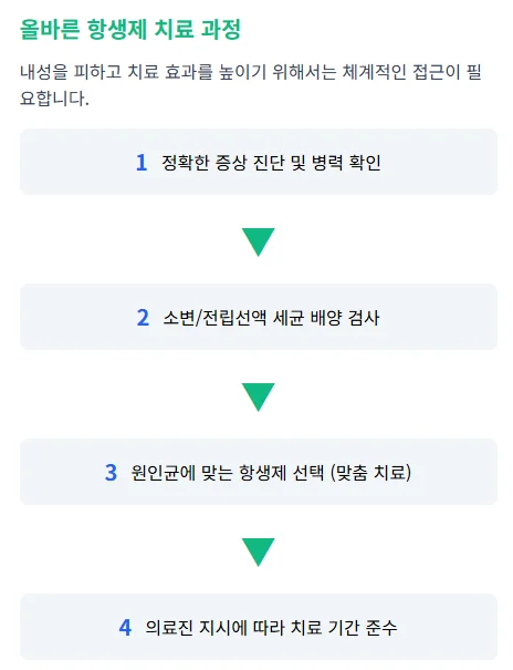 2. 맞춤형 치료의 중요성: 따라서 무턱대고 아무 항생제나 사용하는 것은 좋지 않습니다. 저희 굿모닝 비뇨기과에서는 정확한 세균 배양 검사를 통해 어떤 균에 감염되었는지 확인하고, 그 균에 가장 효과적인 항생제를 선택하여 맞춤형 치료를 진행합니다. 그래야만 불필요한 항생제 사용을 줄이고 치료 효과를 극대화할 수 있습니다.