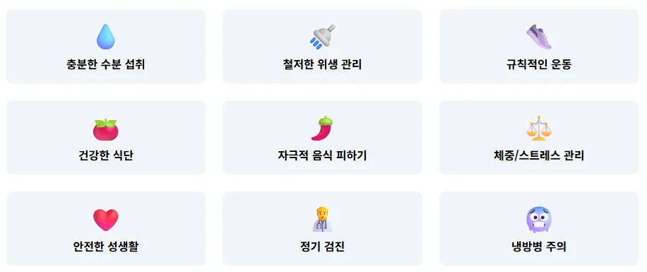 • 충분한 수분 섭취: 여름철 탈수는 물론, 소변을 통해 요로계 세균을 배출하는 데 도움을 줍니다. 하루 2리터 이상의 물을 마시는 것이 좋습니다.