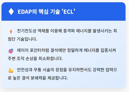 EDAP 쇄석기의 핵심 기술인 ECL 방식은 전도성 액체를 이용해 충격파 에너지를 발생시킵니다. 이 에너지는 마치 정교한 레이저 포인터처럼 결석에만 현미경처럼 정밀하게 집중됩니다. 주변 조직에는 거의 영향을 주지 않으면서, 오직 결석에만 효율적으로 에너지를 전달하여 치료 효과를 극대화하는 것이죠.