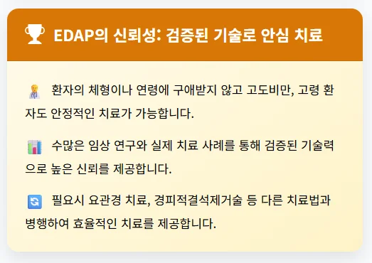 안전성 입증: 고령 환자나 기저 질환(고혈압, 당뇨 등)이 있는 환자도 안전하게 치료받을 수 있도록 설계된 검증된 기술입니다. 다양한 임상 경험을 통해 그 안전성과 효과가 입증되었습니다.