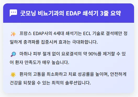 천안 굿모닝 비뇨기과의 EDAP 쇄석기는 마취나 피부 절개 없이 요로결석의 약 90%를 제거할 수 있으며, 필요시 반복하여 시술받을 수 있다는 여러 장점 때문에 환자 만족도가 매우 높습니다. 그럼 이제 EDAP 쇄석기가 환자분들께 어떤 놀라운 이점을 제공하는지 자세히 알아볼까요?